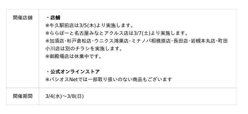 ![[3/4(水)~3/8(日)]190店舗になりました!【春一番SALE 】をファッションプラザ[パシオス]にて開催!](https://prtimes.jp/img/120375/100/resize/d120375-100-70fb033c8c97b45ee601-4.jpg)