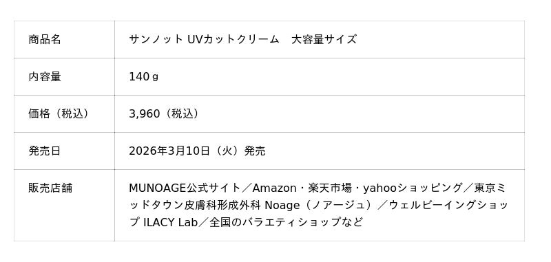 リゾートトラスト株式会社(以下、リゾートトラスト)のグループ企業である株式会社アドバンスト・メディカル・ケア(東京都港区、代表取締役社長:古川哲也)は、再生医療※1発想のコスメブランド「MUNOAGE(ミューノアージュ)」の紫外線対策ブランド「サンノット」シリーズより、2024年3月発売の「サンノット UVカットクリーム(SPF50+・PA++++)」〈顔・からだ用日焼け止めクリーム〉(50g 税込2,970円)に対するお客様の「もっとたっぷり使いたい」という声を受け、大容量サイズ(140g 税込3,960円)を2026年3月10日(火)より販売いたします。季節を問わず紫外線対策が必須となった今、毎日惜しみなく使用できる大容量タイプで、より多くのお客様のニーズにお応えします。