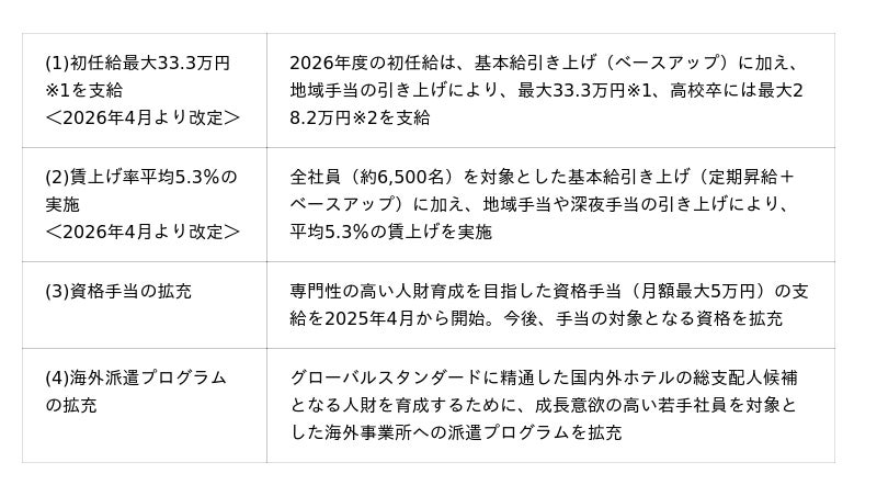 2026年度においては、初任給最大33.3万円※1や全社員平均5.3%の賃上げを実施いたします。また、全施設の従業員のエンゲージメント向上を企図した「休日数の引き上げ」を実施することで、ワークライフバランスの充実や働きやすさの実感が高まり、最高のサービスに繋がる好循環の創出を目指してまいります。