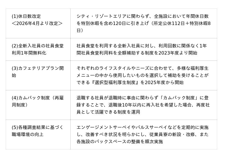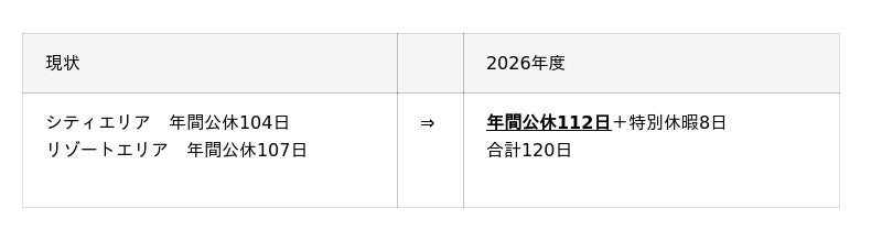 (1)休日数改定24時間365日稼働するホテル業において、休日数を確保することは長年、大きな課題とされております。そのような中、当社は、ホテル業界のフロントランナーとして、2026年度より、シティ・リゾートエリアともに「休日数の引き上げ」を実施し、従業員のワークライフバランスの充実や働きやすさの実感を高め、最高のサービスに繋がる好循環の創出を目指してまいります。