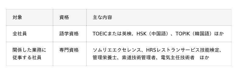 資格は「語学資格」と「専門資格」に分類し、業務貢献や取得難易度などに応じて月額3千円~2万円の支給額を設定。複数資格の保有者に対しては月額最大5万円まで支給し、優れた語学力や高度な専門資格で事業に貢献する人財に対する投資を実施しています。