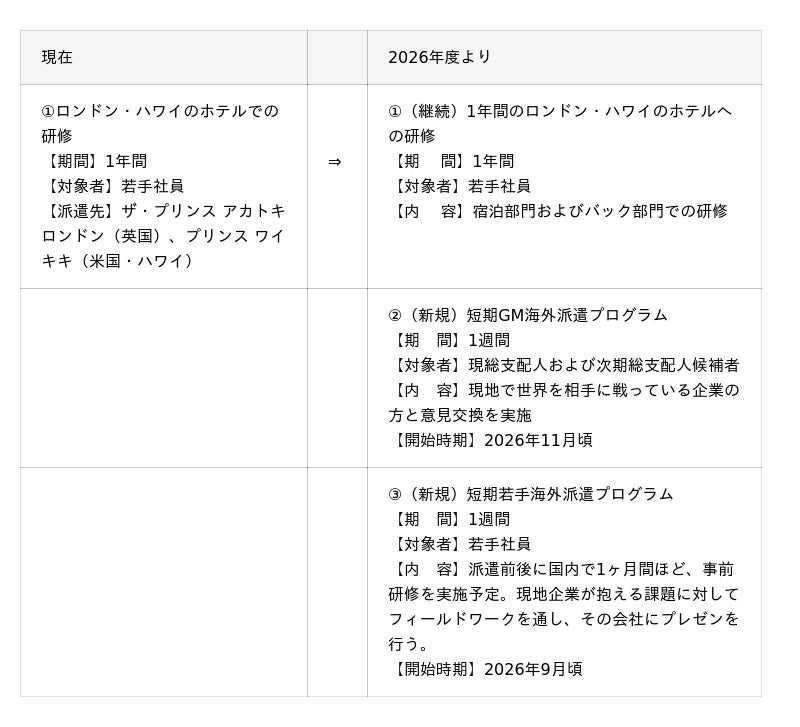 グローバルスタンダードに精通した国内外ホテルの総支配人候補となる人財を育成するために、成長意欲の高い若手社員を対象とした海外事業所への派遣プログラムを2023年度から運用しています。これまで7名の若手社員がロンドン、ハワイのホテルで研修を行い、コミュニケーション能力やモチベーション向上につながっております。その中で、若手従業員のみならず総支配人候補となる中堅従業員の参加意欲の高まりや、短期間なら参加してみたいという若手従業員の声、さらに、より多くの従業員が参加できる機会を提供したいという会社側の思いを反映し、2026年度よりプログラム内容と対象者を拡大いたします。