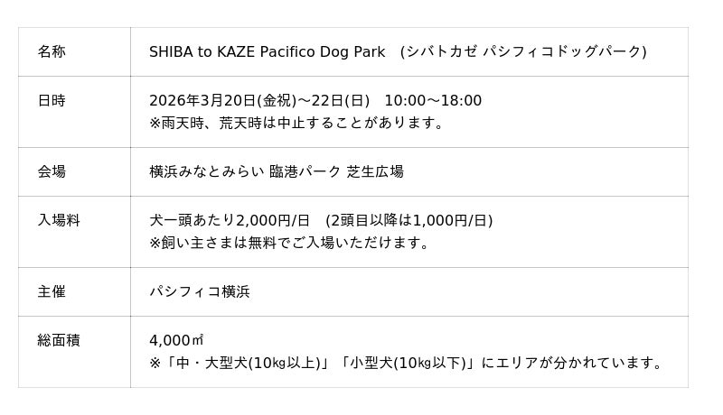 「SHIBA to KAZE Pacifico Dog Park」公式サイト:https://www.pacifico.co.jp/event/pacifico_dog_park