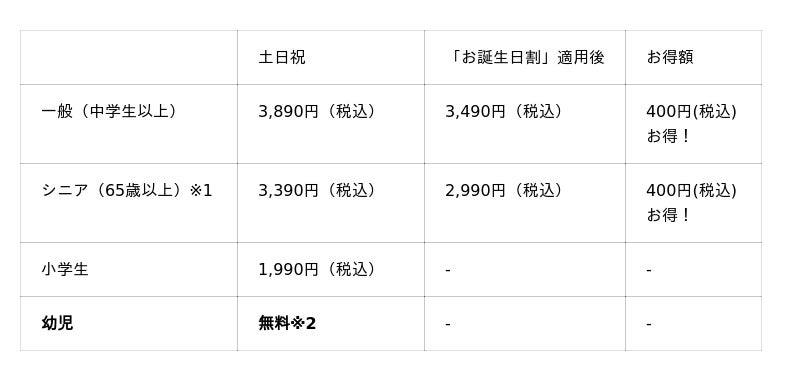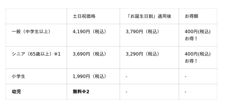 ※2:保護者1名様につき幼児2名様まで無料。3名様以上は1名様につき990円(税込)頂戴します。