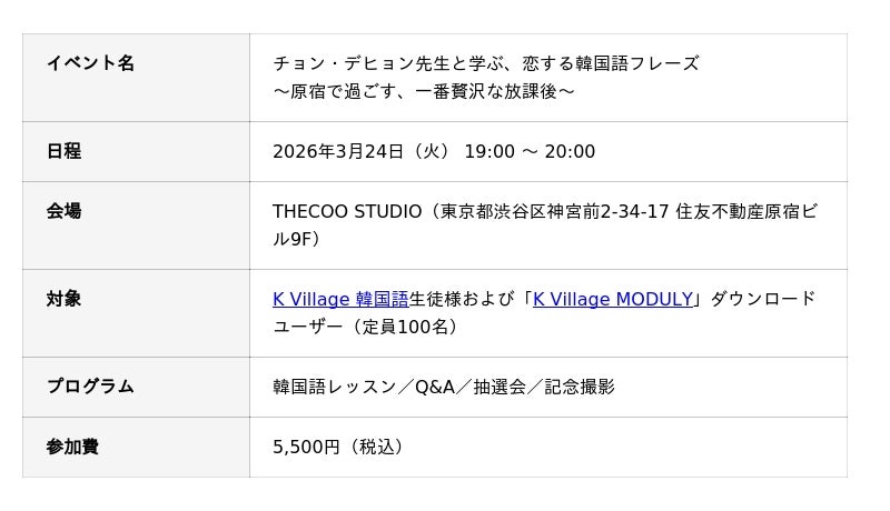 本イベントは、K Villageが運営するアプリ「K Village MODULY」のユーザーおよびK Village 韓国語生徒の皆様を対象とした、100名限定の特別なイベントです。