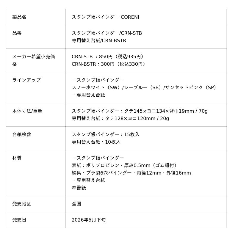 ナカバヤシ株式会社(本社:大阪市中央区、社長:中林一良)は、ページの入れ替えができるスタンプ帳「スタンプ帳バインダー CORENI」を2026年5月下旬より全国で順次発売します。また発売に先駆け4月中旬より順次、全国のロフトにて先行発売いたします。